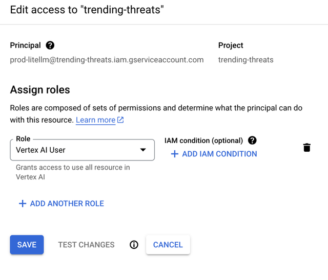 1. Specify the Service Account as the principal and Vertex AI User as the role